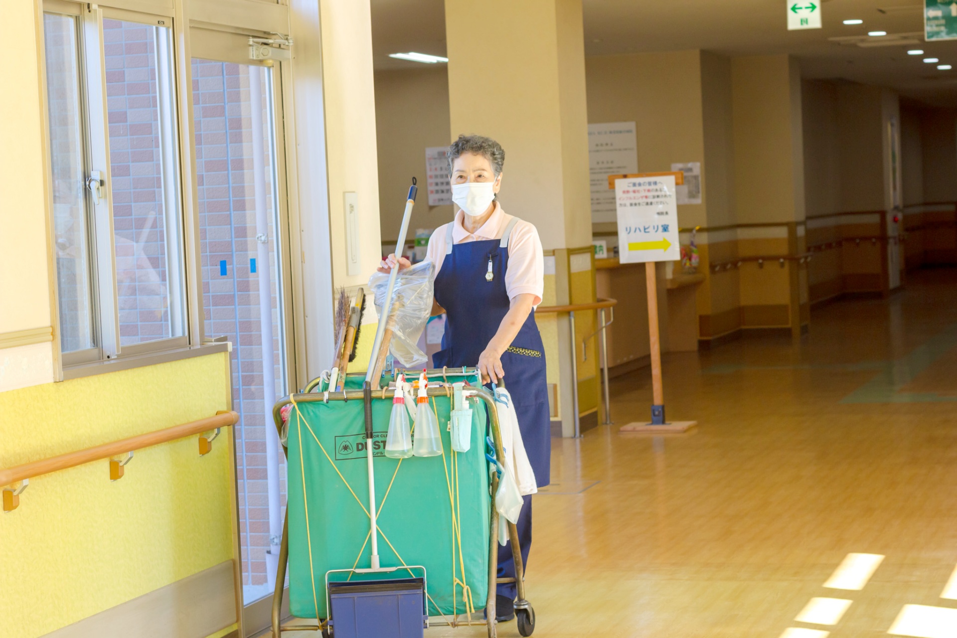 仕事内容は院内フロア・通路の床掃除、トイレ(床・便器の掃除、ペーパータオル等の回収、消耗品の補充等)、部屋(病室・処置室等の床掃除、拭き上げ)の掃除、ゴミの回収です。曜日によって清掃をする部屋・エリアを分けており、清掃スタッフで手分けして対応しています。清掃をおこなう部屋・エリアは異なりますが、担当する業務は同じです。
